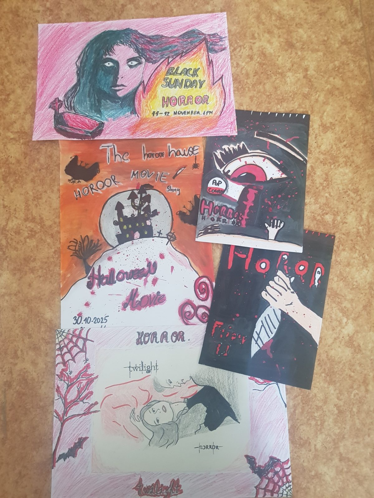Naši deváťáci se do halloweenské atmosféry ponořili s velkým nasazením! První tři vyučovací hodiny jsme tvořili tematické dekorace a výrobky – děsivé brčko s upířími zuby, malého ducha z kelímku. Dokonce jsme si uspořádali i malou výstavku „Casperů“. Nechyběly ani retro hororové plakáty ve stylu starých „Horror Movie“ filmů z 80. let – nápadité, originální a opravdu efektní!