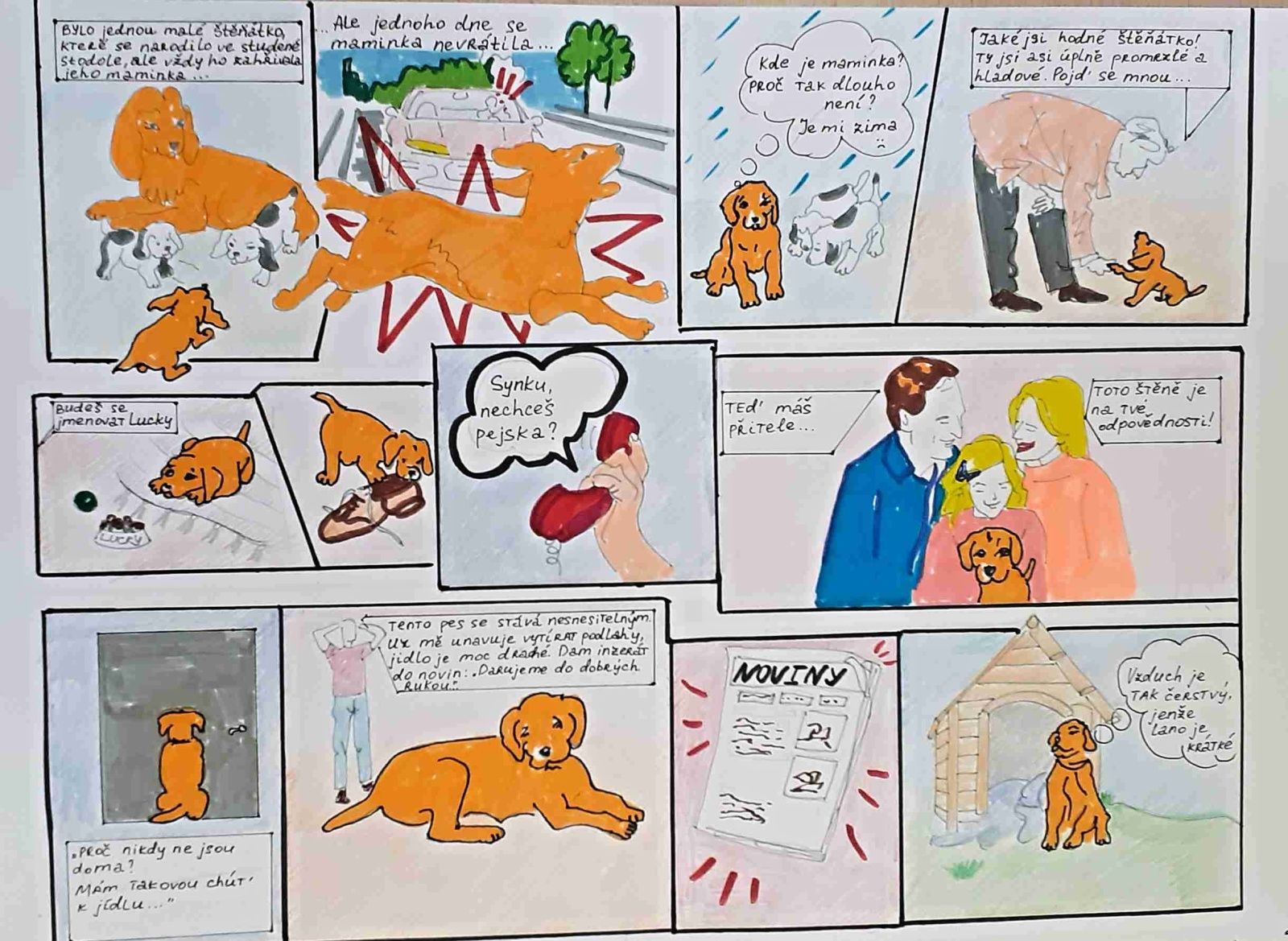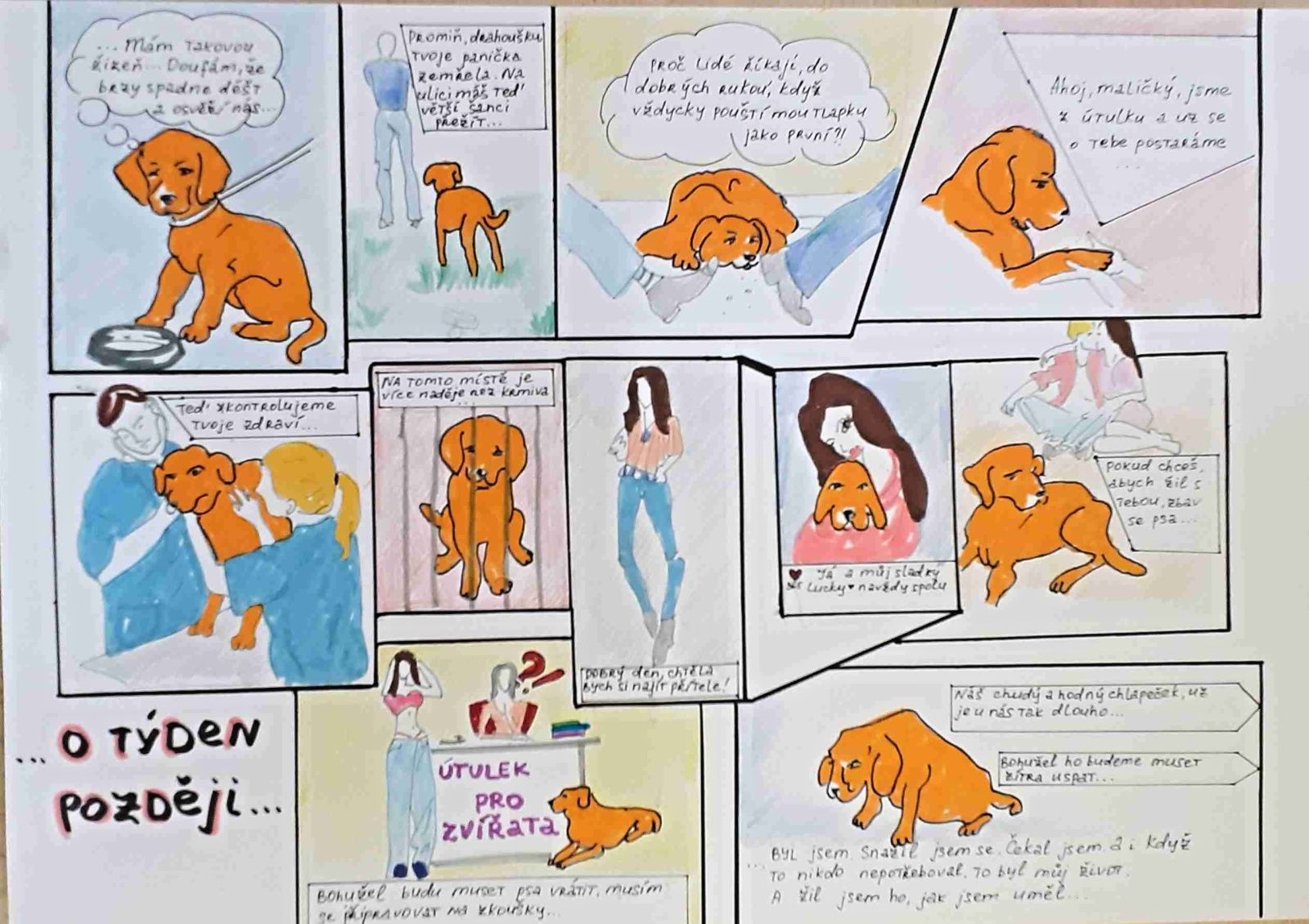 Žáci VIII. třídy se pustili do vymýšlení komiksů k problematice zodpovědnosti k domácím mazlíčkům, nezákonných množíren a chovu zvířat. Nápadů byla spousta, ale nakonec jsme do soutěže za Jarošáky poslali zajímavý komiks Příběh štěněte. Vyhodnocení soutěže se blíží, Marharytě, která je autorkou komiksu, přejeme hodně štěstí v soutěži, a i vy máte možnost posoudit, jak se jí práce podařila.