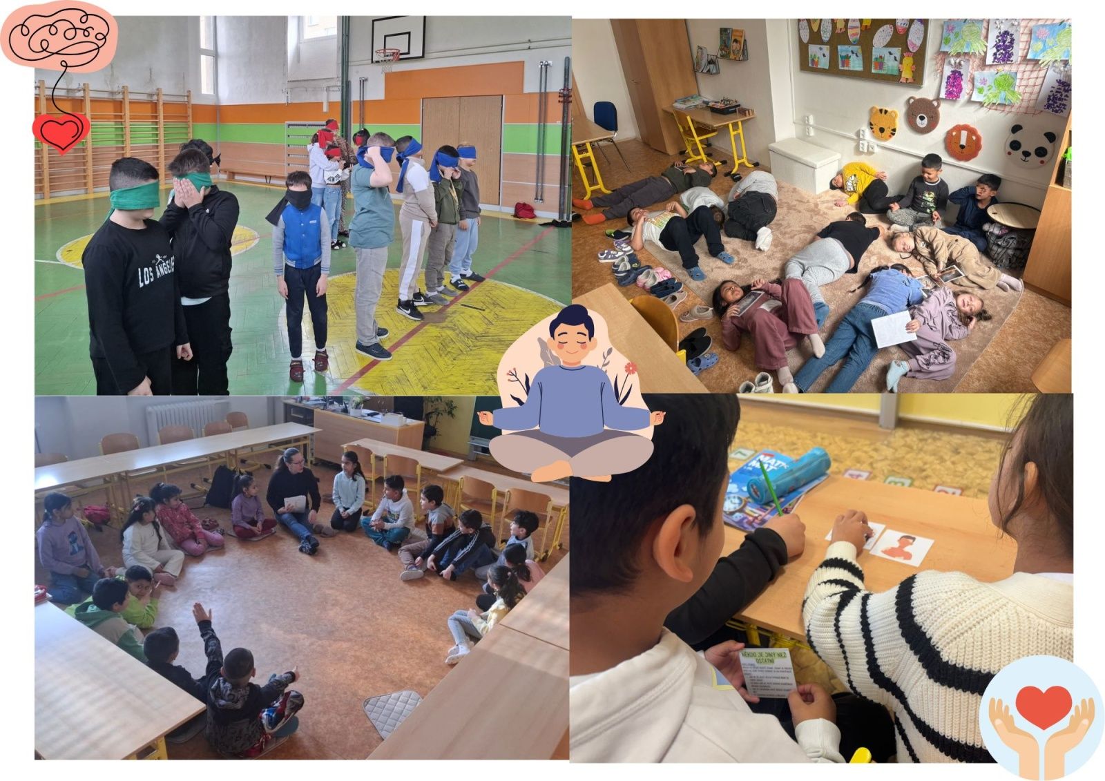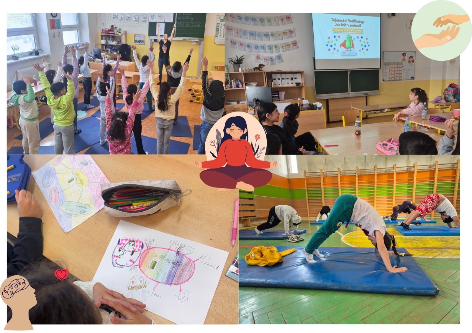 Projekt probíhal napříč celou školou a každý třídní učitel ho mohl pojmout podle potřeb své třídy, kterou zná nejlépe. Vznikl tak prostor pro rozmanité aktivity zaměřené na rozvoj celkové pohody – povídali jsme si, vyzkoušeli si jógu, uvolňovací cvičení i relaxační techniky, podívali jsme se na to, co se děje v našem těle i hlavě, když prožíváme emoce, a ti nejmenší si dokonce „zahráli na kočky“, při čemž objevovali, co jim dělá dobře a jak si navodit pocit bezpečí a klidu.